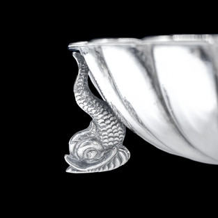 貝殻をモチーフにしたデザインとシルバーの輝く質感が織りなす相乗効果で、高級感のある空気を纏っています。3本の脚部は獣頭のデザインが施されており、小ぶりながらも優美で存在感がありますね。しっかりとした重みを感じ、シルバープレートの厚みもたっぷり。
